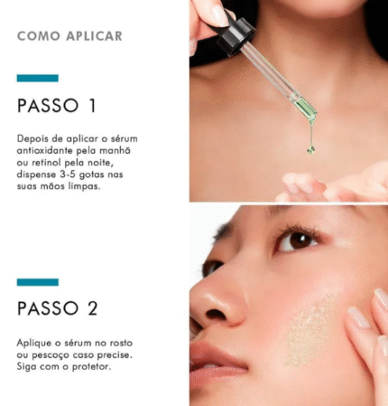 Aplique uma pequena quantidade à noite, sobre a pele limpa e seca. Utilize em noites alternadas no início da rotina e ajuste conforme sua adaptação. Durante o dia, use sempre proteção solar.