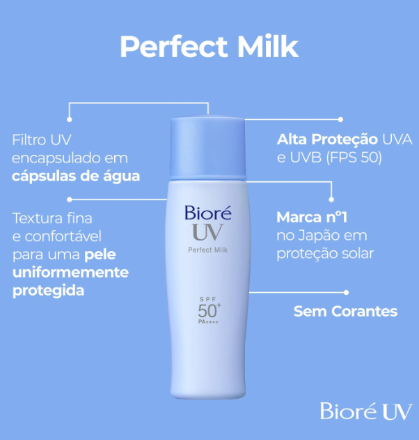 O Protetor Solar Facial FPS50 Bioré UV Perfect Milk 40ml é desenvolvido para oferecer alta proteção diária com sensação leve e confortável na pele. Sua textura ultrafluida espalha facilmente e forma uma camada resistente ao suor e à oleosidade, ideal para quem precisa de um protetor que permaneça eficaz ao longo do dia. Ao ser aplicado, ele deixa um toque seco imediato, ajudando a controlar o brilho e mantendo a pele com aparência mais uniforme.
